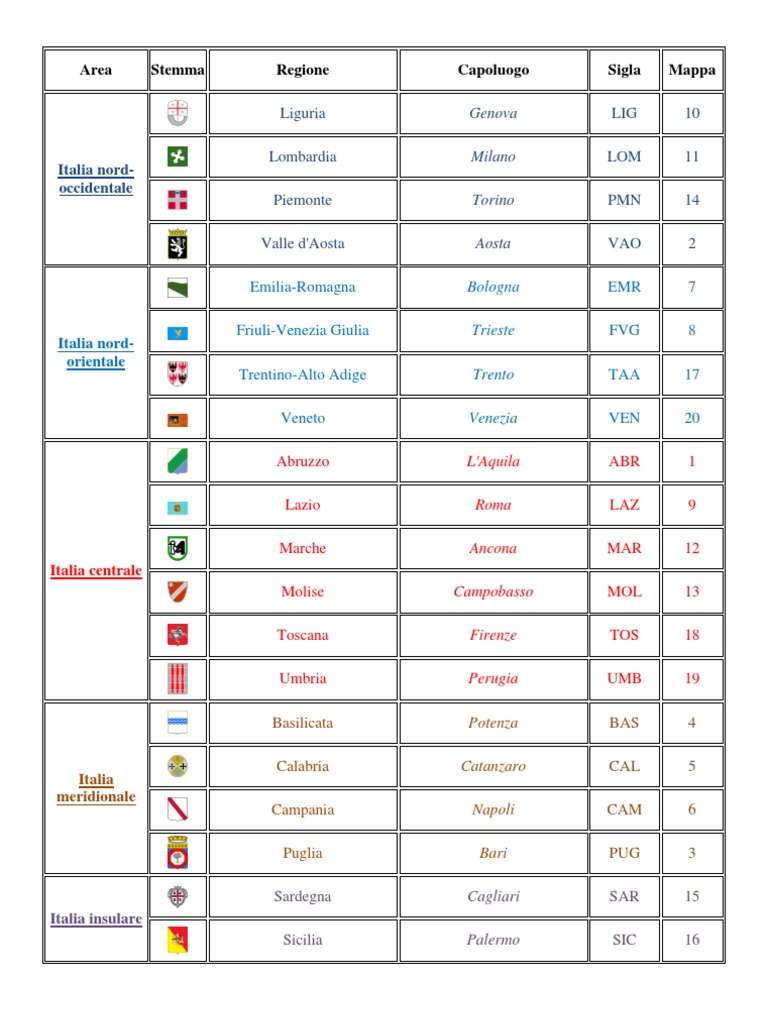 Learn vocabulary, terms, and more with flashcards, games, and other study tools. In italia ci sono 20 regioni e altrettanti capoluoghi, ma non tutti li conoscono o semplicemente non li ricordano tutti. In ogni domanda ti chiediamo qual è il capoluogo di una regione italiana. Elenco delle regioni e delle province con cartina geografica qui sotto trovate un'utile cartina, mappa delle regioni italiane, giusto per capire dove si collocano. 1 elenco dei capoluoghi di provincia;